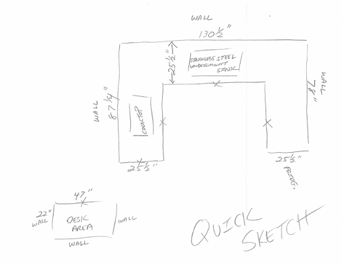 Lastly, run a tape measure across all of the sides of your countertops and note the numbers on the sketch.